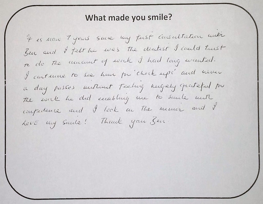 It is now 7 years since my first consultation with Ben and I felt he was the dentist I could trust to do the amount of work I had long wanted. I continue to see him for “check-ups” and never a day passes without feeling hugely grateful for the work he did enabling me to smile with confidence and I look in the mirror and I LOVE my smile! Thank you Ben.